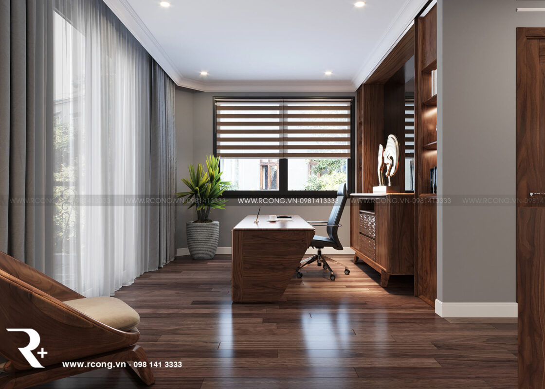 Gia chủ mong muốn một không gian làm việc yên tĩnh, đầy đủ ánh sáng và mang lại cảm hứng trong công việc. Vì vậy, R Cộng đã thiết kế nội thất phòng làm việc gồm một bộ bàn ghế, một tủ sách đơn giản, thiết kế hiện đại với nội thất gỗ óc chó cao cấp. Cùng với một không gian không quá lớn, đảm bảo yên tĩnh cùng với của sổ có thể ngắm không gian bên ngoài.