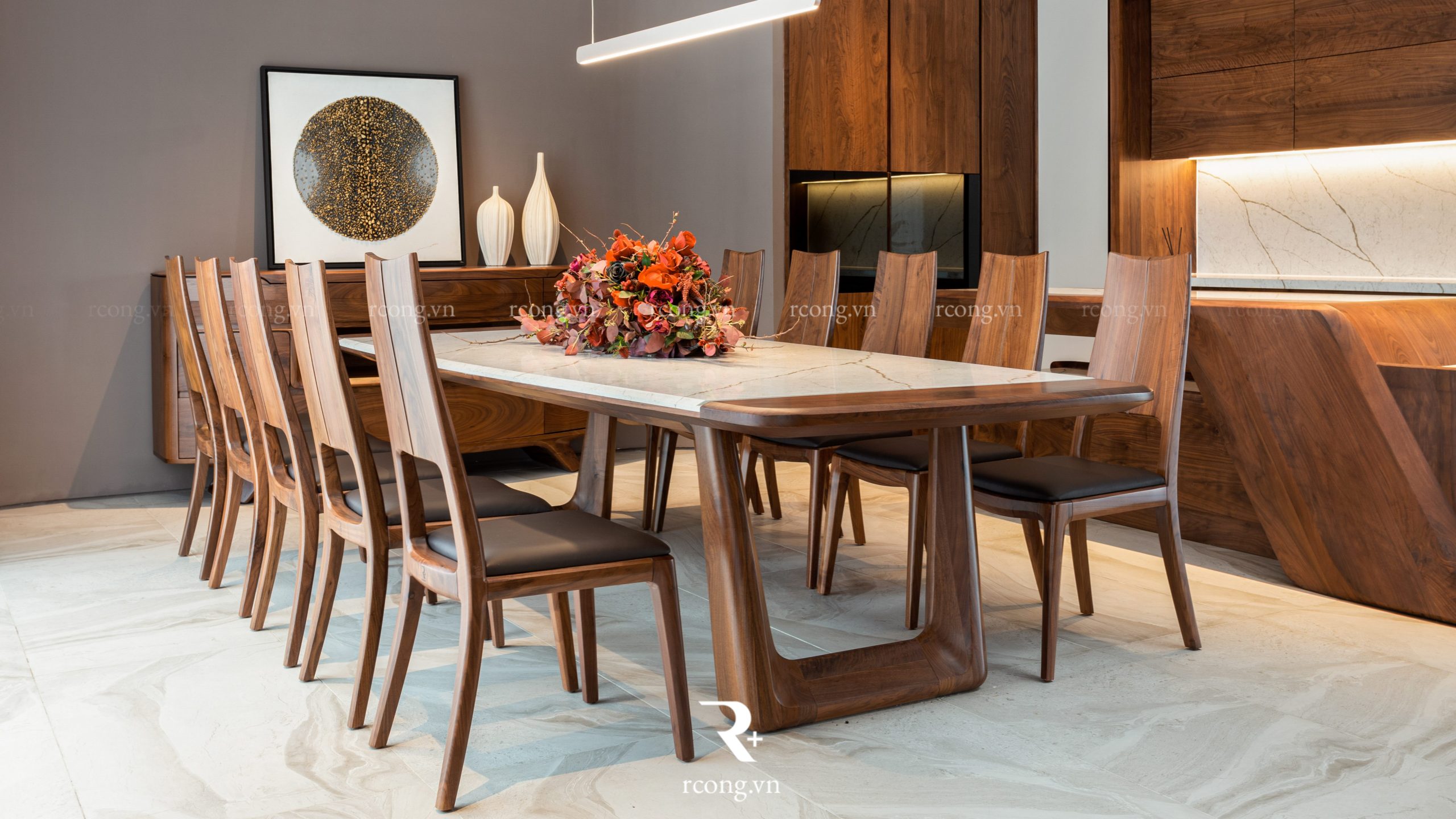 Với những căn hộ penthouse, chuyên gia kiến tạo của Nội thất R Cộng sẽ tư vấn để thiết kế bộ bàn ghế ăn phù hợp với diện tích của căn bếp ăn đồng thời tối ưu công năng sử dụng. Với những giải pháp giải phóng không gian “đột phá”, bộ bàn ghế sẽ càng nổi bật trong từng đường nét, dáng hình. Quý vị có thể chiêm ngưỡng một số mẫu bàn ăn gỗ óc chó đẹp năm của Đơn vị dưới đây: