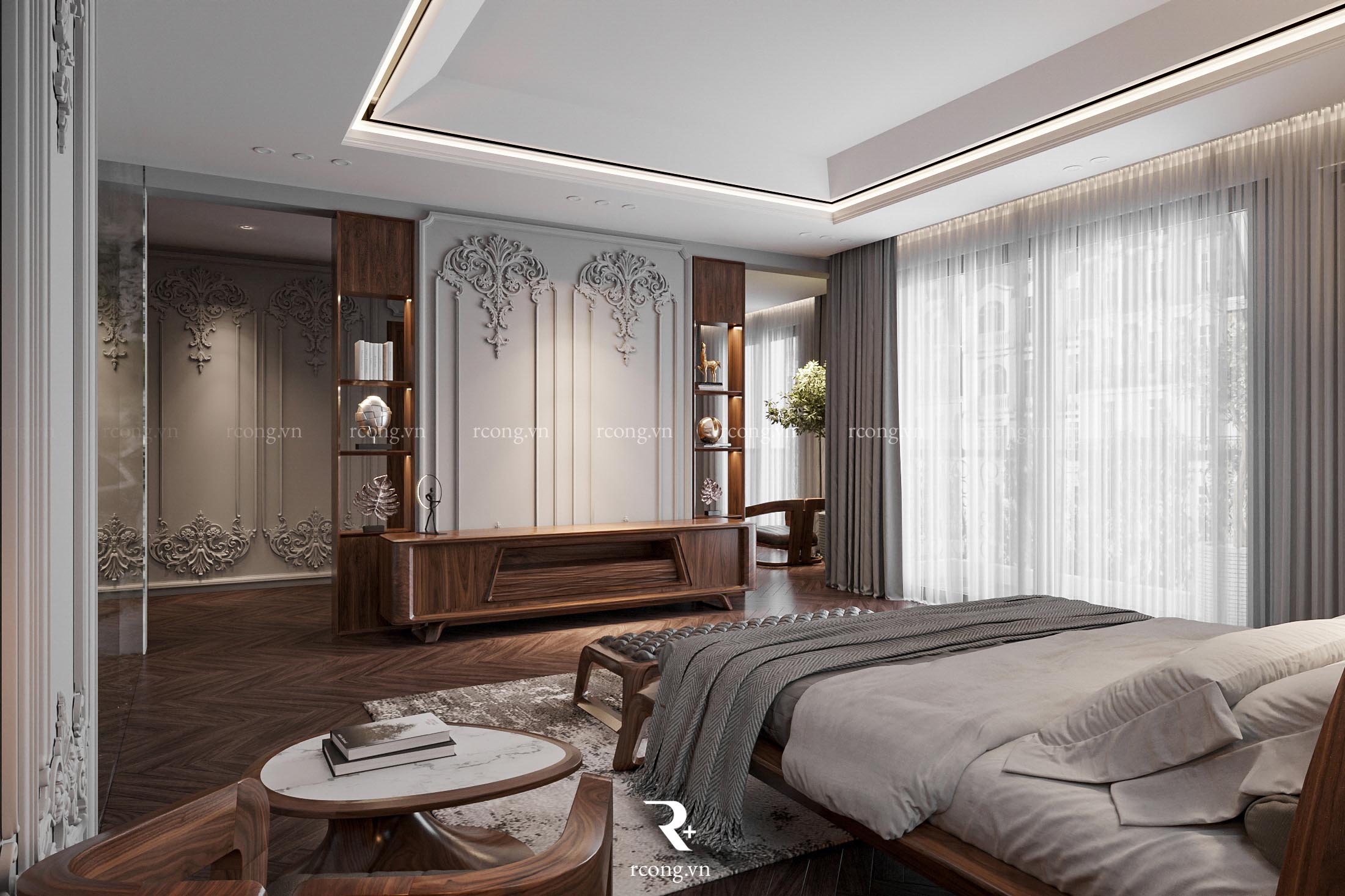 Combo phòng ngủ gỗ óc chó trong căn biệt thự của gia đình chị Vân gồm có giường ngủ, tap đầu giường, ghế băng, kệ tivi, tủ trang trí, bàn làm việc, tủ quần áo, phòng tắm. Phong cách thiết kế hiện đại là chủ đạo, điểm xuyết các diện tường tân cổ điển.