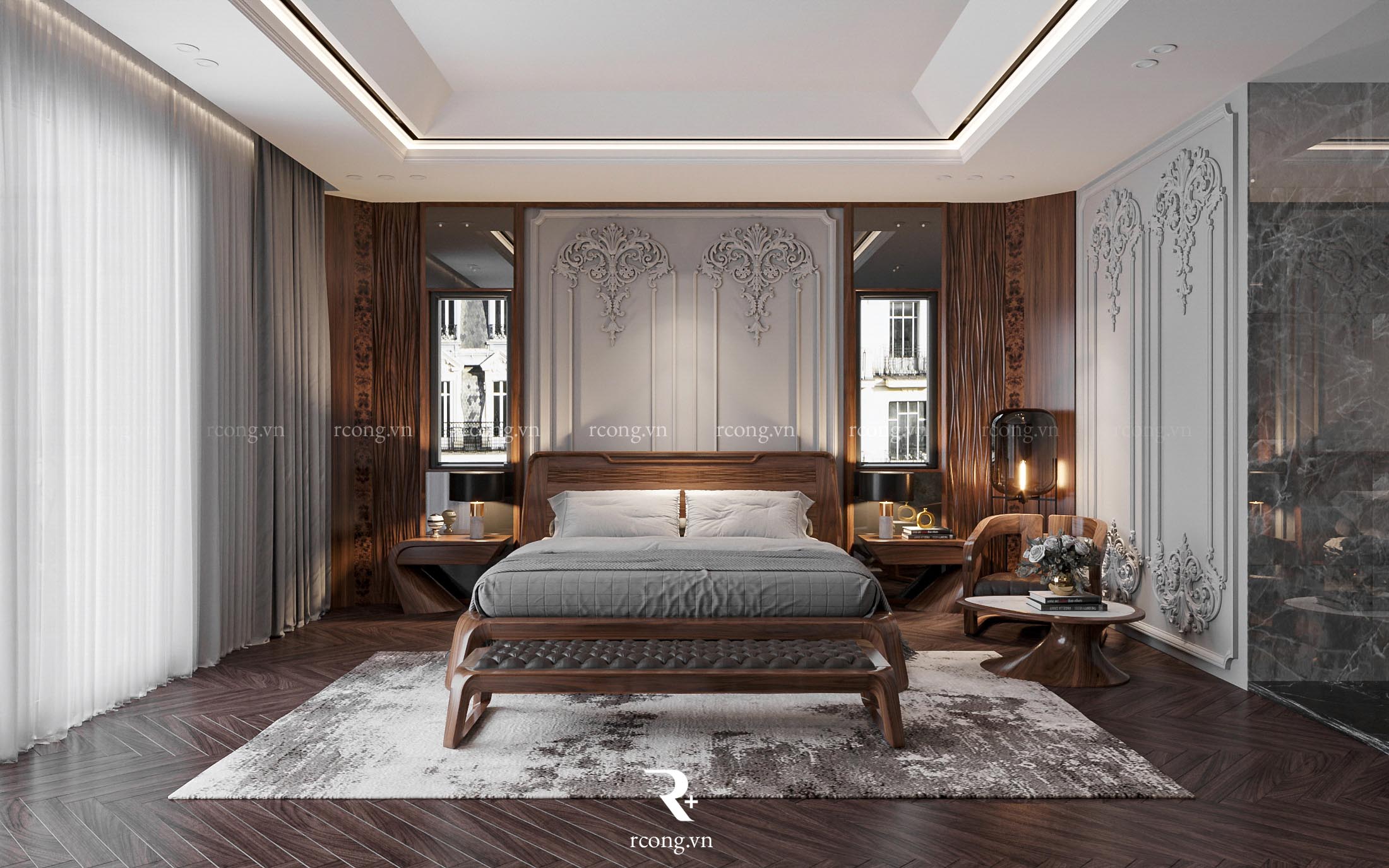 Được bố trí ở trung tâm của phòng ngủ, chiếc giường ngủ gỗ óc chó hiện đại với đường cong chân giường tinh tế. Đây là mẫu giường ngủ trong bộ sưu tập nội thật mới nhất năm 2022 của R Cộng. Các KTS đã tỉ mỉ trong từng chi tiết, đường nét để sáng tạo mẫu giường tối ưu cho không gian phòng ngủ, đồng thời thỏa mãn sở thích và gu thẩm mỹ riêng của vợ chồng gia chủ.
