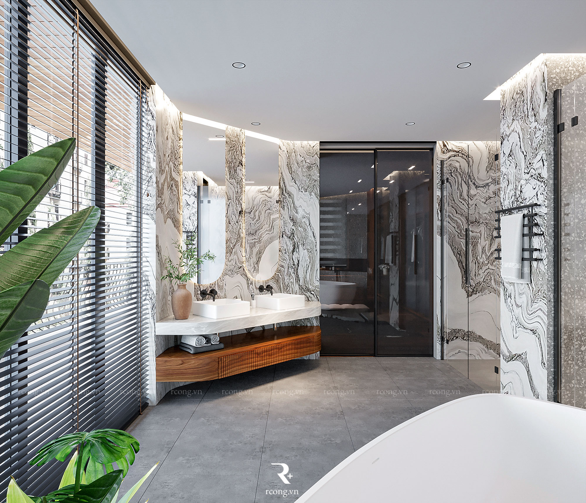 Phòng tắm cũng là một điểm nhấn ấn tượng cho toàn bộ không gian phòng ngủ gỗ óc chó tích hợp 3 trong 1. Để tạo cảm giác gần gũi với thiên nhiên và mang đến những phút giây thư giãn thoải mái nhất cho gia chủ, giải pháp thiết kế hiện đại phỏng sinh học đã được áp dụng với vòng tròn sỏi rải quanh khu vực bồn tắm thương hiệu Daros. Tô điểm thêm là những đường vân uốn lượn của đá thạch anh kết hợp với đá terrazzo ốp tường.
