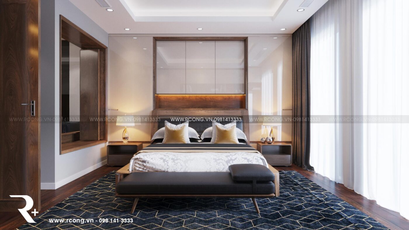 Phòng ngủ master được thiết kế đơn giản, hiện đại