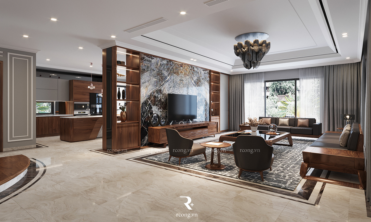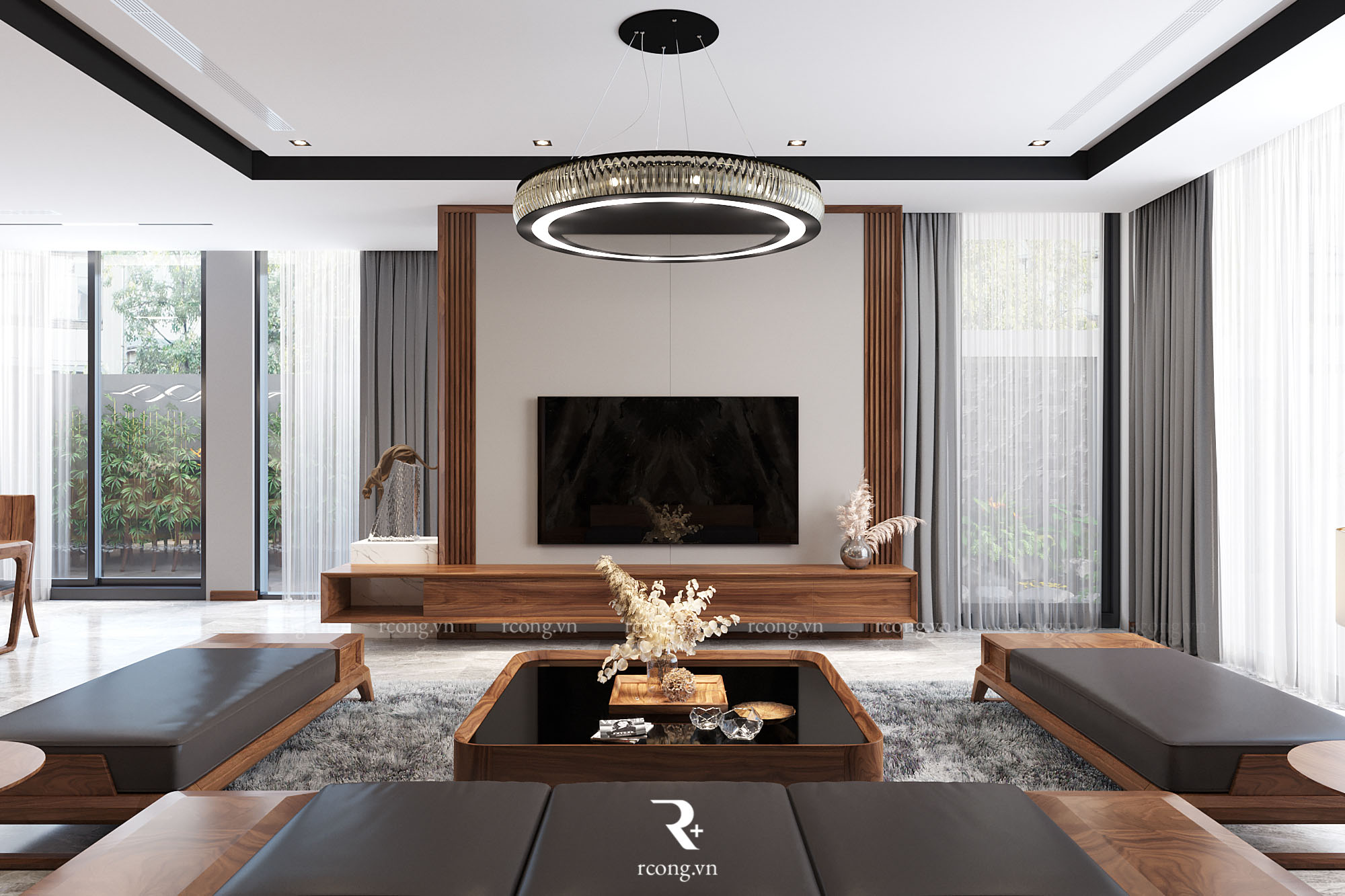 Mẫu thiết kế nội thất phòng khách gỗ óc chó biệt thự sân vườn do chuyên gia kiến tạo không gian của Nội thất R Cộng thực hiện vừa tối ưu công năng sử dụng đồng thời mang đậm giá trị thẩm mĩ.