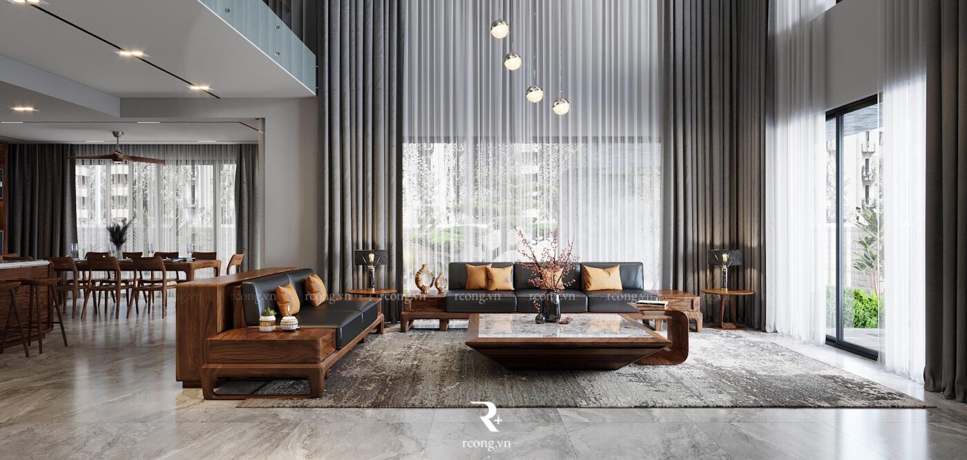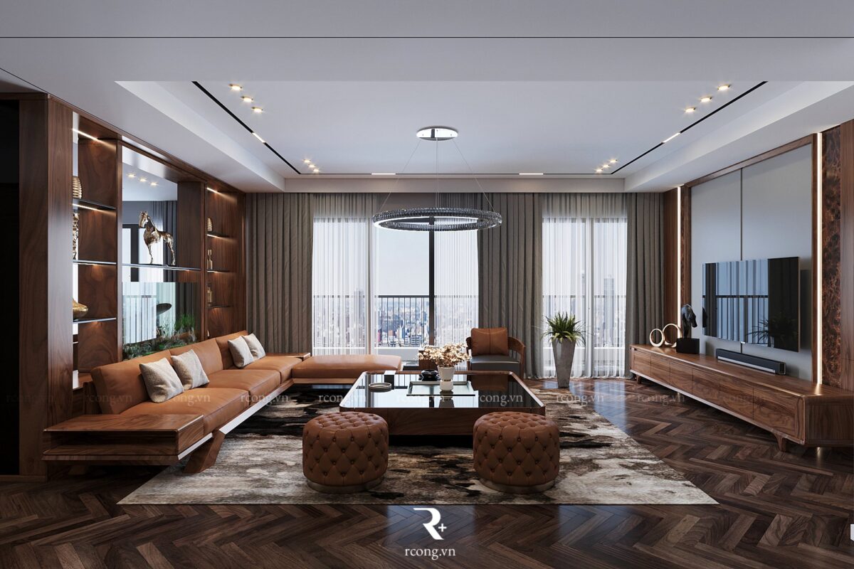 Với kinh nghiệm nhiều năm thiết kế thi công nội thất nhà ở cao cấp, Nội thất R Cộng đã kiến tạo nên những không gian phòng khách với những bộ ghế sofa chữ L gỗ óc chó hiện đại, sang trọng và “độc bản”.