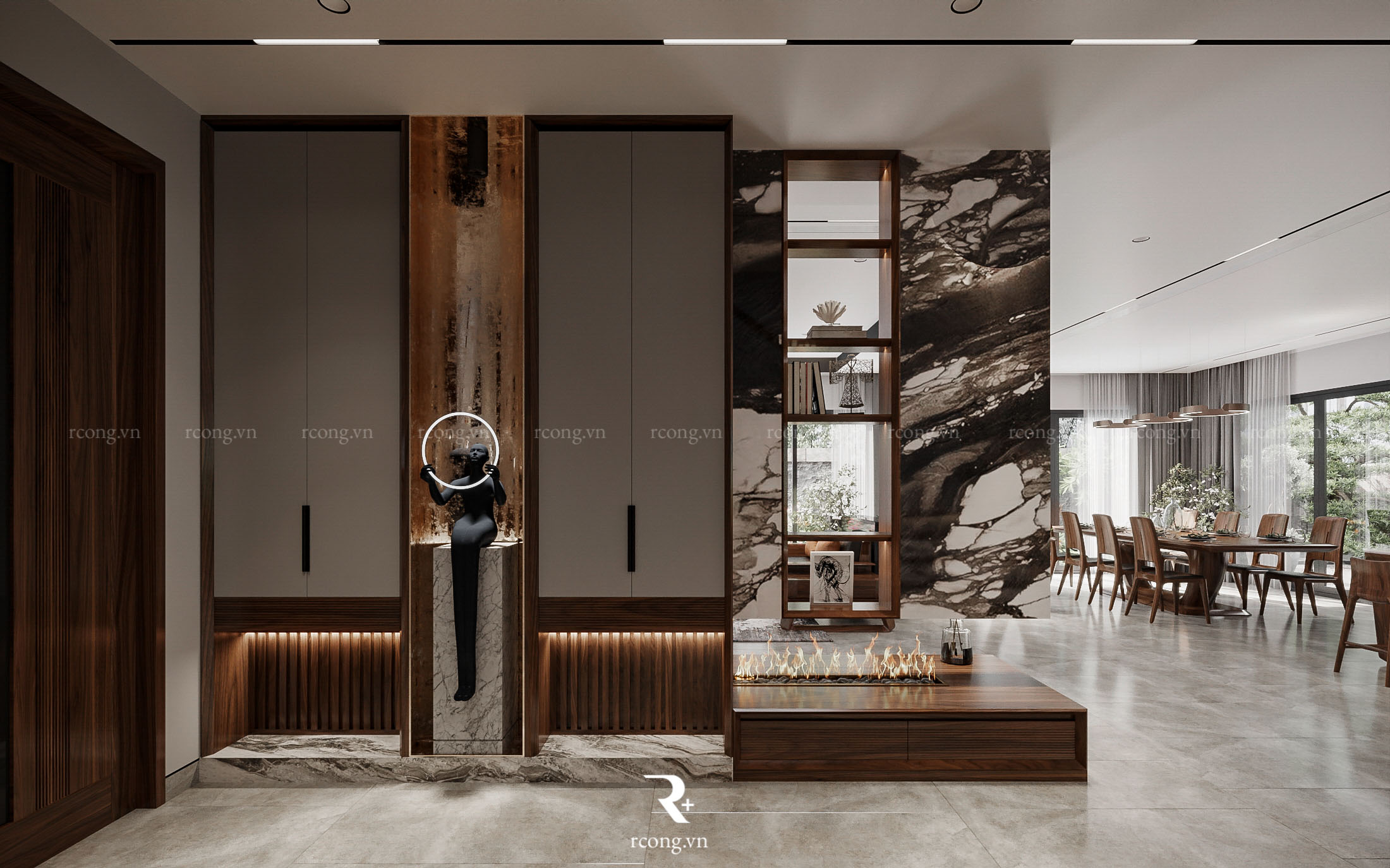 Một trong đặc trưng phong cách hiện đại là những mảng tường sử dụng vách đá marble đậm chất nghệ. Chi tiết trang trí các kiến trúc sư sắp xếp khéo léo với đèn chùm, đồng hồ treo tường tăng tính thẩm mĩ cho không gian. Khu vực sảnh tiền phòng khách cũng được bố trí sang trọng, đẳng cấp, thu hút kiến tạo không gian.