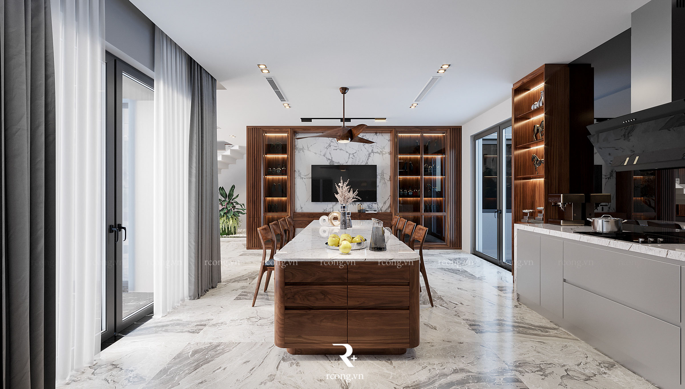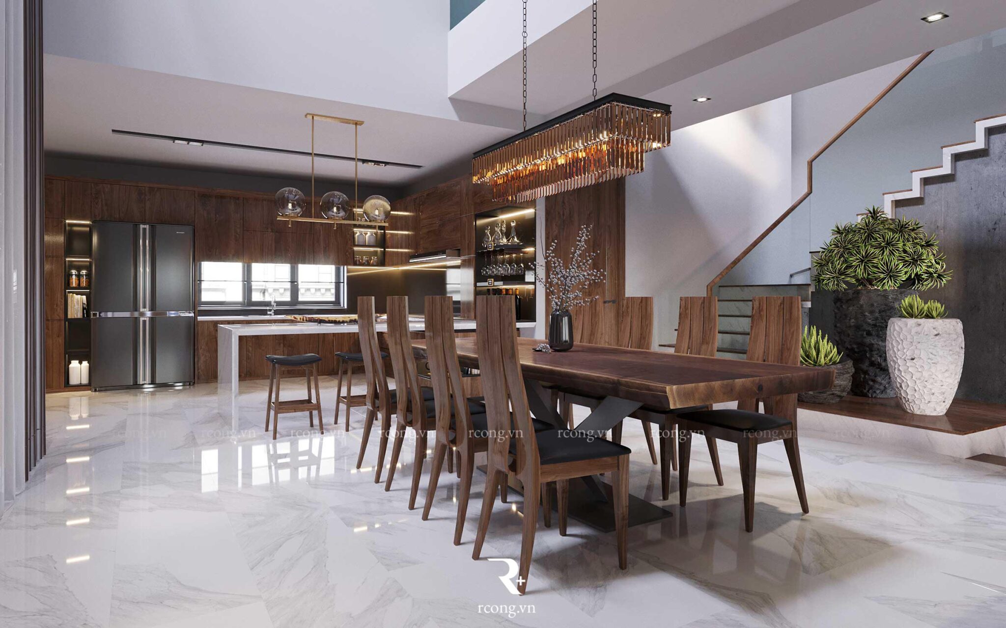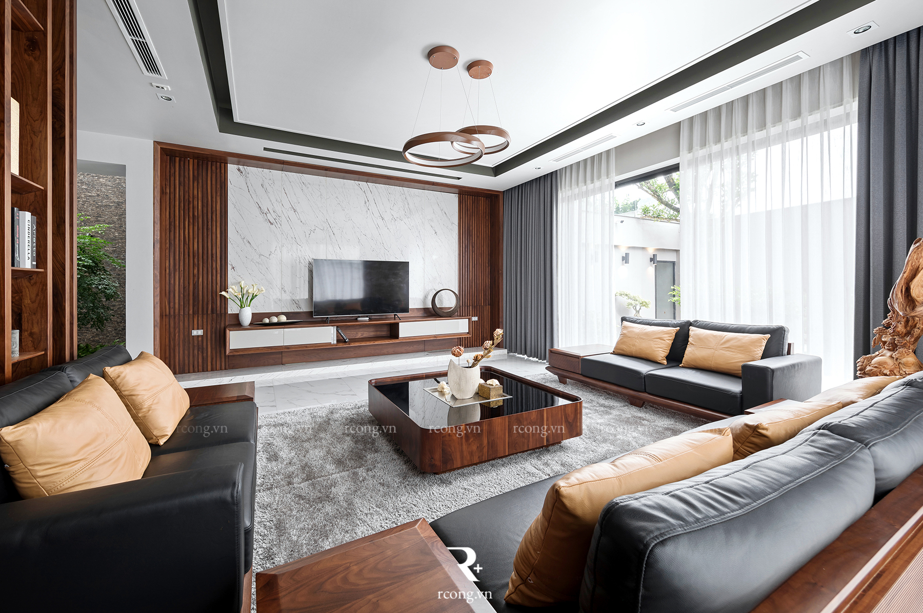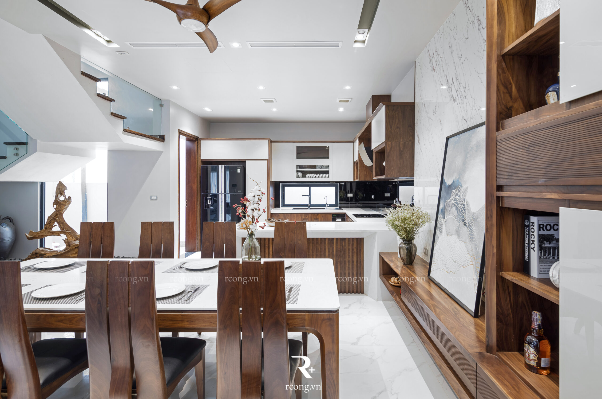 Là căn biệt thự liền kề, nên gia chủ mong muốn ngoài sự tinh tế và sang trọng thì không gian sống phải thoáng rộng. Thỏa lòng gia chủ, kiến trúc sư R Cộng đã có những giải pháp thiết kế sáng tạo mang lại những view nhìn rộng rãi, thoáng đãng, hòa nhập với thiên nhiên. Kết hợp sử dụng nội thất gỗ óc chó tự nhiên theo phong cách hiện đại với những vật liệu nội thất cao cấp khác tạo dựng một công trình tuyệt đẹp với điểm nhấn độc bản.